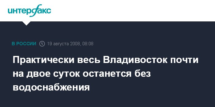 Как сообщили агентству "Интерфакс-Дальний Восток" в пресс-службе мэрии Владивостока, город будет отключен от водоснабжения в полночь по местному времени 20 августа, возобновить подачу воды планируется к 18:00 21 августа. "Вода будет поступать только жителям Первомайского района, 71-го и 64-го микрорайонов Владивостока", - рассказал представитель пресс-службы.