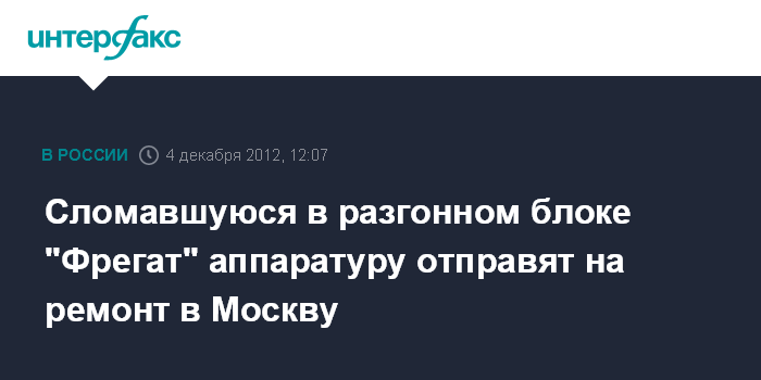 Москва. 4 декабря. INTERFAX.RU - Аппаратуру системы управления разгонного блока "Фрегат", из-за выявленных технических проблем в которой был отложен запуск спутника "Глонасс-К", отправят в Москву для ремонта, сообщил во вторник "Интерфаксу-АВН" источник в ракетно-космической отрасли.