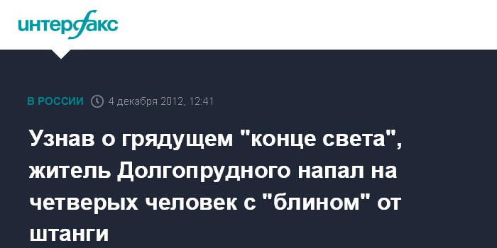 Москва. 4 декабря. INTERFAX.RU - Агрессию психбольного, отправившего на больничные койки четверых человек при помощи "блина" от штанги в подмосковном Долгопрудном, спровоцировали вести о грядущем "конце света", сообщили "Интерфаксу" в пресс-службе ГУ МВД России по Московской области.