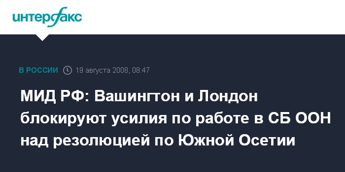 Москва. 19 августа. INTERFAX.RU - МИД РФ обвинил США и Великобританию в сопротивлении усилиям России и Франции по принятию резолюции СБ ООН, закрепляющей принципы урегулирования в Южной Осетии.