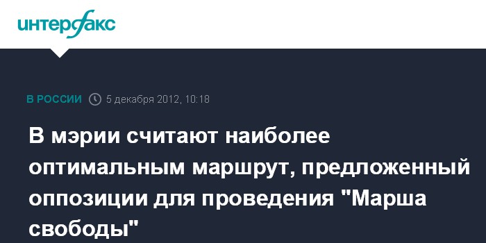 Москва. 5 декабря. INTERFAX.RU - В мэрии Москвы считают наиболее приемлемым вариант проведения 15 декабря акции оппозиции под названием "Марш свободы" от Страстного бульвара до проспекта Академика Сахарова. "Это тот вариант, про который мы можем сказать, что он наиболее удобен для москвичей в плане минимального перекрытия улиц", - заявил "Интерфаксу" в среду глава департамента региональной безопасности мэрии Москвы Алексей Майоров.