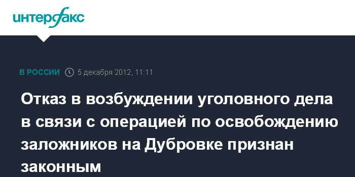 Отказ в возбуждении уголовного дела в связи с операцией по освобождению заложников на Дубровке признан законным