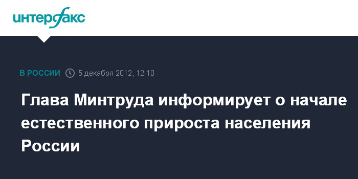 Москва. 5 декабря. INTERFAX.RU - В России впервые за много лет зарегистрирован естественный прирост населения, говорится поступившем в "Интерфакс" в среду сообщении пресс-службы Минтруда РФ со ссылкой на главу ведомства Максима Топилина.