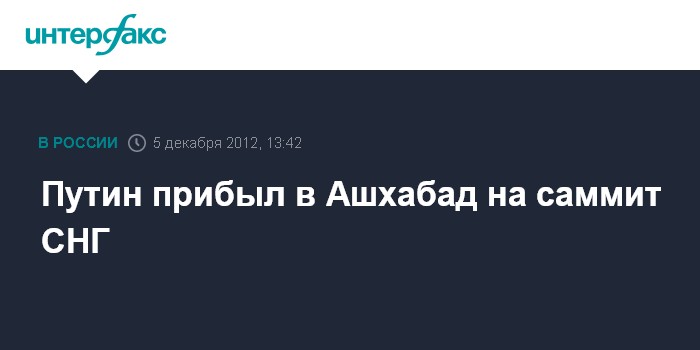Ашхабад. 5 декабря. INTERFAX.RU - Самолет президента России Владимира Путина совершил посадку в Ашхабаде, где пройдет заседание Совета глав государств СНГ, в котором до конца 2012 года председательствует Туркменистан.