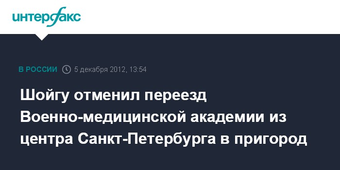 Красногорск (Московская область). 5 декабря. INTERFAX.RU - Переезд Военно-медицинской академии имени Кирова из центра Санкт-Петербурга в Курортный район отменен, заявил министр обороны РФ Сергей Шойгу в среду на совещании по проблемам военной медицины в подмосковном Красногорске.