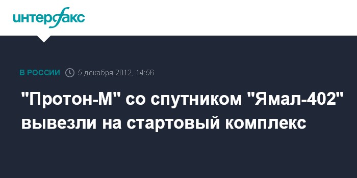 Байконур. 5 декабря. INTERFAX.RU - Ракету космического назначения "Протон-М" с разгонным блоком "Бриз-М", предназначенную для выведения на целевую орбиту российского коммуникационного космического аппарата "Ямал-402", в среду вывезли на стартовый комплекс площадки N200 Байконура, сообщил агентству "Интерфакс-" источник на космодроме.