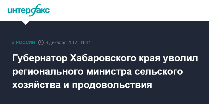 Губернатор Хабаровского края уволил регионального министра сельского хозяйства и продовольствия