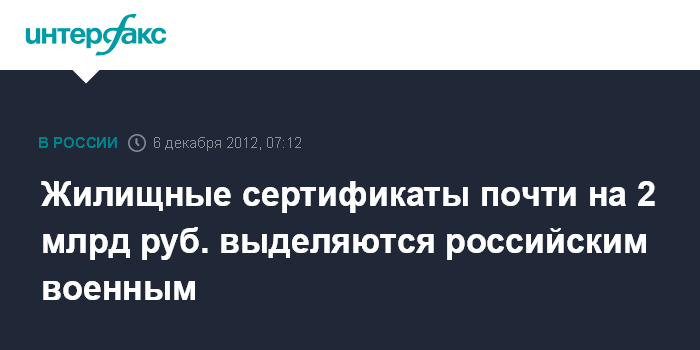 Как сообщает пресс-служба правительства РФ, таким образом реализовывается поручение президента страны о направлении 1,8 млрд руб. для выдачи государственных жилищных сертификатов военнослужащим Минобороны. Изменениями, внесенными в программу "Жилище" на 2011 - 2015 годы, постановлением правительства РФ от 22 ноября 2012 г. № 1204, предусматривается дополнительное выделение 2,3 млрд рублей для выдачи государственных жилищных сертификатов военнослужащим, сотрудникам органов внутренних дел, подлежащим увольнению с военной службы, и приравненным к ним лицам.