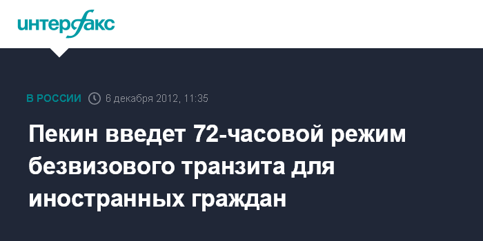 Москва. 6 декабря. INTERFAX.RU - Пекин с 1 января 2013 года введет 72-часовой режим безвизового транзита для граждан 45 стран мира, включая Россию, сообщает агентство "Синьхуа".