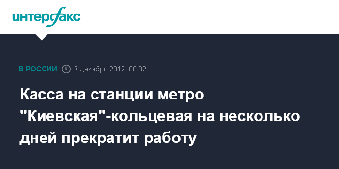 Москва. 7 декабря. INTERFAX.RU - Реализация проездных билетов в кассе станции "Киевская" Кольцевой линии (выход к ТЦ "Европейский") будет временно прекращена с 20:00 7 декабря до окончания работы метрополитена 9 декабря 2012 года.