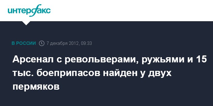 Пермь. 7 декабря. INTERFAX.RU - Ружья, пистолеты разных марок и более 15 тысяч боеприпасов обнаружили сотрудники УФСБ по Пермскому краю в квартире и машине двух местных жителей в результате оперативно-розыскных действий в ночь на пятницу.