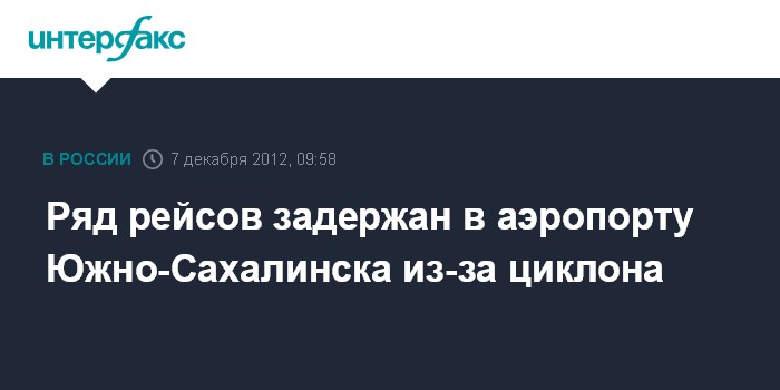 Из-за бушующей стихии до вечера задержаны рейсы авиакомпании "Сахалинские авиакомпании" из Южно-Сахалинска в Оху и Владивосток, в Сеул, соответственно отложены и обратные рейсы. До 20:00 местного времени (13:00 мск) задерживается рейс №1743 компании "Аэрофлот" из Южно-Сахалинска в Москву.