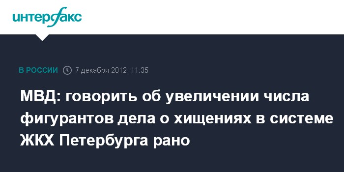 Москва. 7 декабря. INTERFAX.RU - В пресс-центре МВД РФ назвали преждевременными заявления об увеличении количества фигурантов громкого уголовного дела о хищениях в системе ЖКХ Санкт-Петербурга.