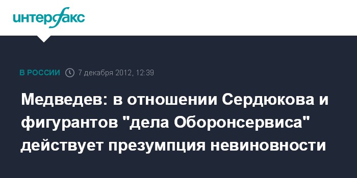 "Что касается его (Сердюкова - ИФ) причастности к коррупционному скандалу вокруг "Оборонсервиса", все это должно быть определено следствием, скрупулезно проанализировано и предъявлено суду", - подчеркнул Медведев в интервью центральным российским телеканалам.