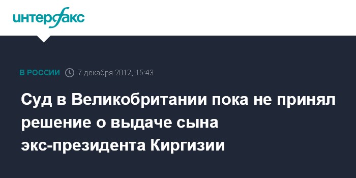 Бишкек. 7 декабря. INTERFAX.RU - В Великобритании суд отложил оглашение решения по делу об экстрадиции в США сына бывшего президента Киргизии Максима Бакиева на следующий год, сообщили в пятницу "Интерфаксу" источники в правительстве республики.