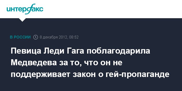 Москва. 8 декабря. ИНТЕРФАКС - Эпатажная поп-исполнительница Леди Гага, у которой в декабре запланированы два концерта в Москве и Санкт-Петербурге, поблагодарила премьера Дмитрия Медведева за то, что он не поддерживает закон о гей-пропаганде.