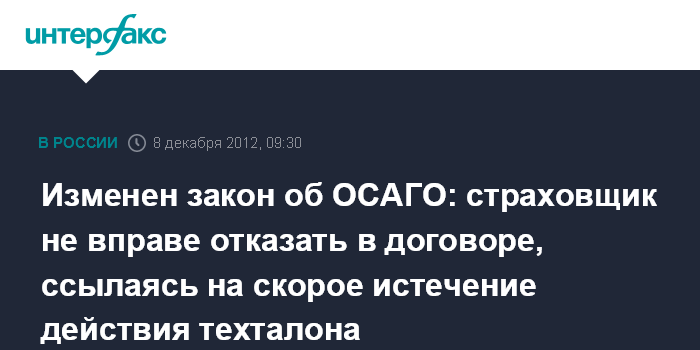Изменен закон об ОСАГО: страховщик не вправе отказать в договоре, ссылаясь на скорое истечение действия техталона