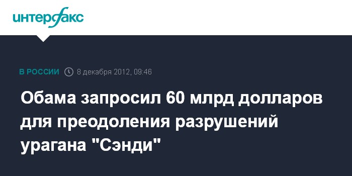 Лондон. 8 декабря. ИНТЕРФАКС - Президент США Барак Обама попросил Конгресс одобрить выделение 60,5 млрд долларов для фондов, помогающих преодолеть последствия урагана.