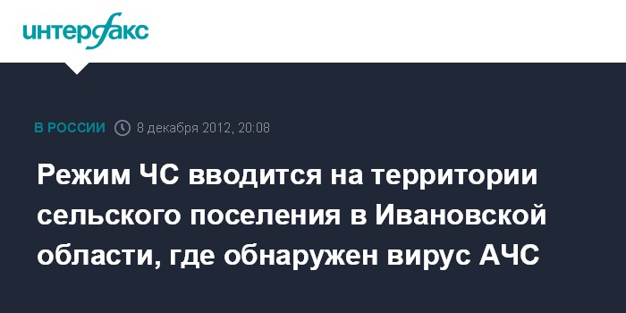 Иваново. 8 декабря. ИНТЕРФАКС-ЦЕНТР - На территории Ивановской области обнаружен вирус африканской чумы свиней, сообщили "Интерфаксу" в региональном управлении МЧС.