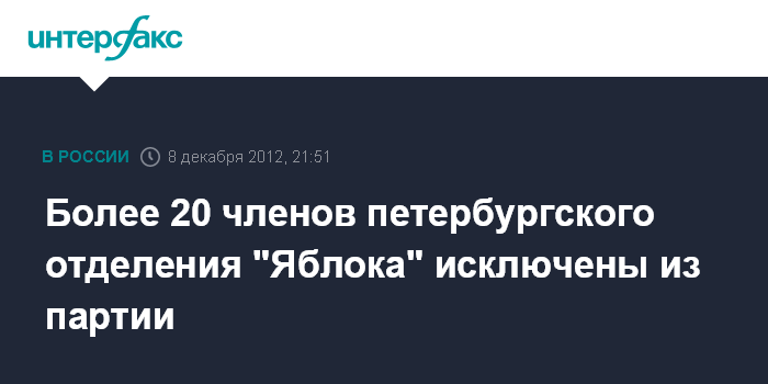 "За фактическое согласие с фальсификациями при подсчете голосов на выборах депутатов Законодательного собрания Санкт-Петербурга 4 декабря 2011 года и поддержку членов партии "Яблоко", получивших подложные мандаты, сотрудничество с участниками фальсификаций, отказ от политической оценки этих фальсификаций из "Яблока" исключены 22 члена петербургского отделения", - говорится в сообщении, размещенном в субботу на сайте партии.