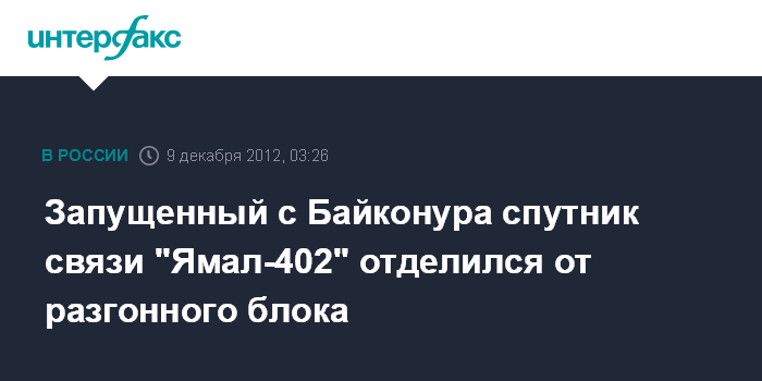 Москва. 9 декабря. ИНТЕРФАКС-АВН - Телекоммуникационный космический аппарат "Ямал-402" отделился от разгонного блока "Бриз-М", сообщили "Интерфаксу-АВН" в пресс-службе Роскосмоса.