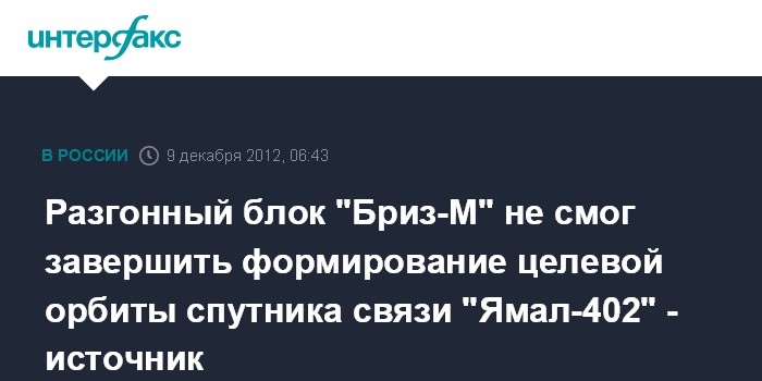 "Разгонный блок "Бриз-М" во время четвертого включения проработал вместо примерно девяти минут пять. В результате он не смог до конца сформировать целевую орбиту спутника "Ямал-402". Эту задачу придется решать за счет использования топлива, которое находится на борту космического аппарата", - сказал собеседник агентства.