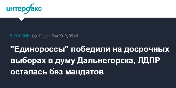 Владивосток. 10 декабря. ИНТЕРФАКС-ДАЛЬНИЙ ВОСТОК - Представители "Единой России" одержали уверенную победу на досрочных выборах в думу приморского Дальнегорска, которая была распущена по решению суда после громкого политического скандала в городе.