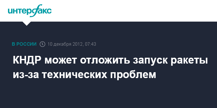 Сеул. 10 декабря. INTERFAX.RU - Запуск ракеты-носителя со спутником, который КНДР планировала произвести в период с 10 по 22 декабря, задерживается из-за технических проблем с третьей ступенью ракеты-носителя, сообщает южнокорейская газета The Chosun Ilbo в понедельник.