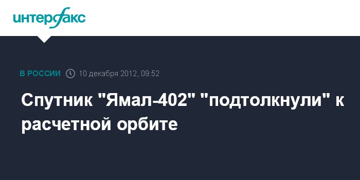 Москва. 10 декабря. INTERFAX.RU - Первый маневр по довыведению космического аппарата "Ямал-402" на расчетную орбиту осуществлен в ночь на понедельник, сообщил "Интерфаксу-АВН" руководитель пресс-службы Роскосмоса Алексей Кузнецов.