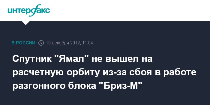 Москва. 10 декабря. ИНТЕРФАКС-АВН - Причиной нештатной работы разгонного блока "Бриз-М", который в воскресенье не смог вывести на нужную орбиту спутник "Ямал-402", скорее всего, стал отказ маршевого двигателя, сказал "Интерфаксу" в понедельник информированный источник в космической отрасли.