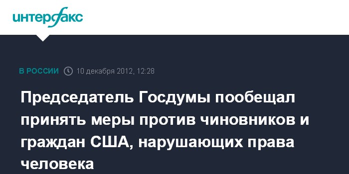 "Мы примем меры по отношению к должностным лицам и гражданам США, грубо нарушившим права человека. Уже на этой неделе Государственная дума рассмотрит законопроект, подготовленный депутатами всех четырех парламентских фракций", - сказал С.Нарышкин на конференции в МГУ в понедельник.