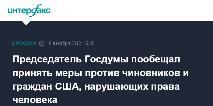 Москва. 10 декабря. INTERFAX.RU - Спикер Госдумы РФ Сергей Нарышкин пообещал принять ответные меры на принятый в США "Закон Магнитского".
