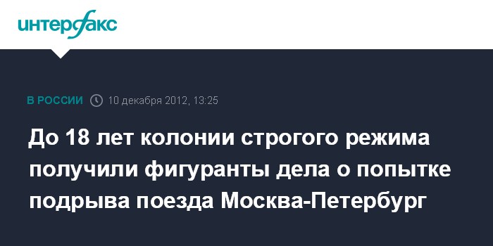 Москва. 10 декабря. INTERFAX.RU - Мосгорсуд в понедельник приговорил обвиняемых в попытке подрыва скоростного поезда "Сапсан" (сообщением "Москва - Санкт-Петербург") летом прошлого года к срокам от 15 до 18 лет лишения свободы.