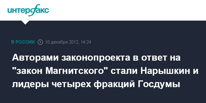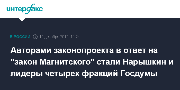 Москва. 10 декабря. INTERFAX.RU - Авторами проекта закона, который Госдума предлагает принять в ответ на "закон Магнитского", выступили спикер Сергей Нарышкин и руководители четырех парламентских фракций - Владимир Васильев ("Единая Россия"), Владимир Жириновский (ЛДПР), Геннадий Зюганов (КПРФ) и Сергей Миронов ("Справедливая Россия").