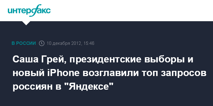 Москва. 10 декабря. INTERFAX.RU – Команда "Яндекса" подвела предварительные итоги поисковых запросов россиян за 2012 год. Согласно предоставленным "Интерфаксу" материалам, пользователей Рунета больше всего в этом году интересовал сайт "webvybory2012 ru", новый девайс от Apple " iphone 5" и наделавший много шума "бозон хиггса".
