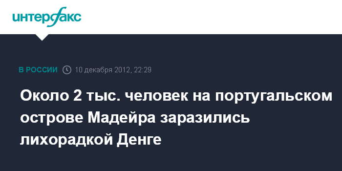 Лиссабон. 10 декабря. INTERFX.RU - На португальском острове Мадейра около 2 тыс. человек заразились лихорадкой Денге, в Европе это произошло впервые с 1920-х годов, сообщил в понедельник в телеинтервью министр здравоохранения Португалии Фернанду Леал да Кошта.