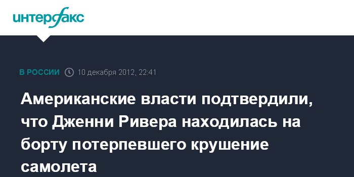 Вашингтон. 10 декабря. INTERFAX.RU - На борту частного самолета, который потерпел крушение в минувшее воскресенье на севере Мексики, действительно находилась знаменитая американская певица мексиканского происхождения Дженни Ривера, заявили в понедельник в Федеральном агентстве транспортной безопасности США.