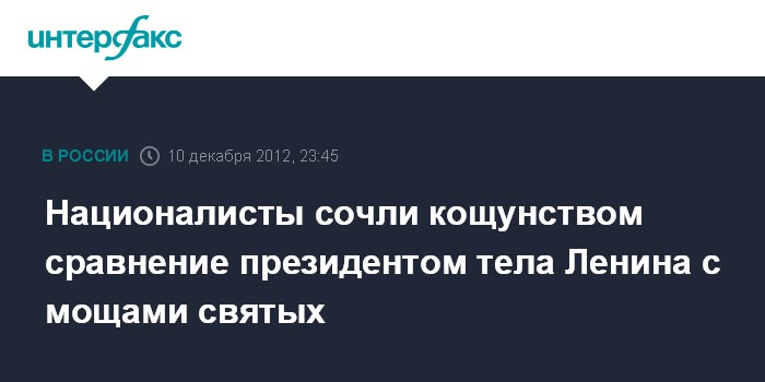 Москва. 10 декабря. INTERFAX.RU - Националисты, которые совместно с православными активистами добиваются выноса Ленина из мавзолея, возмутились заявлением президента РФ Владимира Путина, сравнившего мощи святых с телом вождя мирового пролетариата, заявил лидер объединения "Русские" Дмитрий Демушкин.