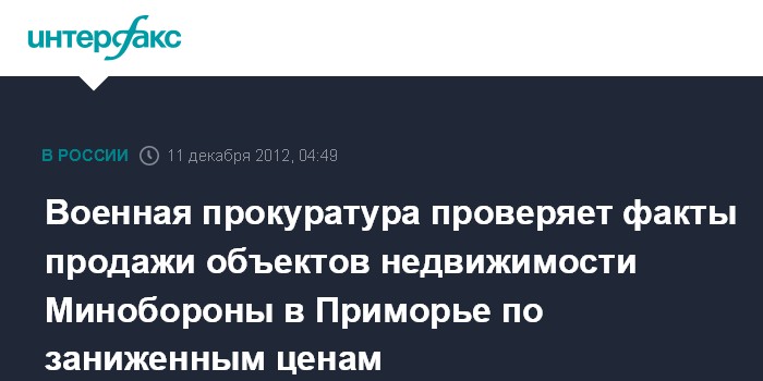 Хабаровск. 11 декабря. ИНТЕРФАКС-ДАЛЬНИЙ ВОСТОК - В Приморском крае шесть объектов недвижимого имущества ОАО "Управление торговли ДВО", реализованных в 2010-2011 годах, возможно, были проданы по заниженным ценам, сообщили агентству "Интерфакс - Дальний Восток" во вторник в военной прокуратуре Восточного военного округа.