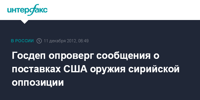 Вашингтон. 11 декабря. ИНТЕРФАКС - Не соответствующими действительности назвала в понедельник официальный представитель госдепартамента США Виктория Нуланд сообщения некоторых СМИ о поставках Вашингтоном оружия сирийской оппозиции.