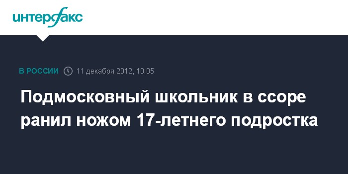 Москва. 11 декабря. INTERFAX.RU - Конфликт двух школьников закончился поножовщиной в Подмосковье, сообщили "Интерфаксу" в пресс-центре МВД России.