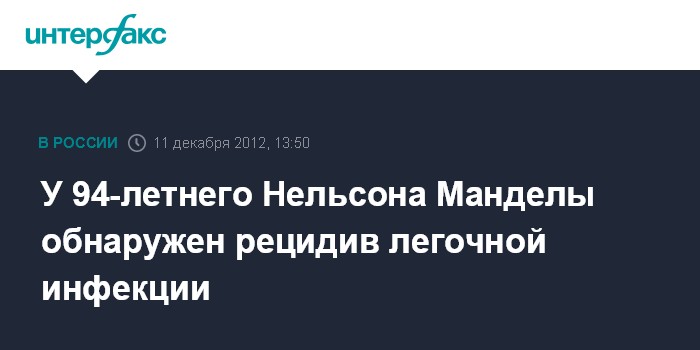 Йоханнесбург. 11 декабря. INTERFAX.RU - У бывшего президента ЮАР Нельсона Манделы диагностировали легочную инфекцию, которой он ранее уже болел, сообщают во вторник власти страны.