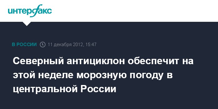 Москва. 11 декабря. INTERFAX.RU - Морозы придут в центр России: холодная и сухая погода сохранится и на выходных, причем днем в субботу и воскресенье столбики термометров опустятся до минус 17 градусов, прогнозирует Росгидромет.