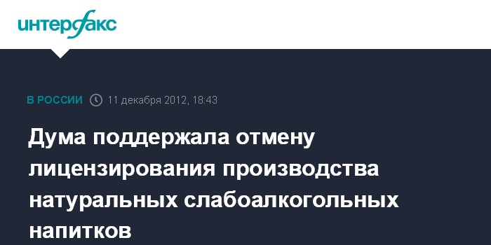 Москва. 11 декабря. INTERFAX.RU - Госдума на заседании во вторник приняла во втором чтении законопроект, которым предлагается вывести из-под лицензирования производство натуральных слабоалкогольных напитков.
