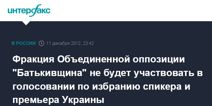 Киев. 11 декабря. INTERFAX.RU - Фракция Объединенной оппозиции "Батькивщина" в Верховной Раде 7-го созыва не будет участвовать в голосовании по избранию спикера и премьера.