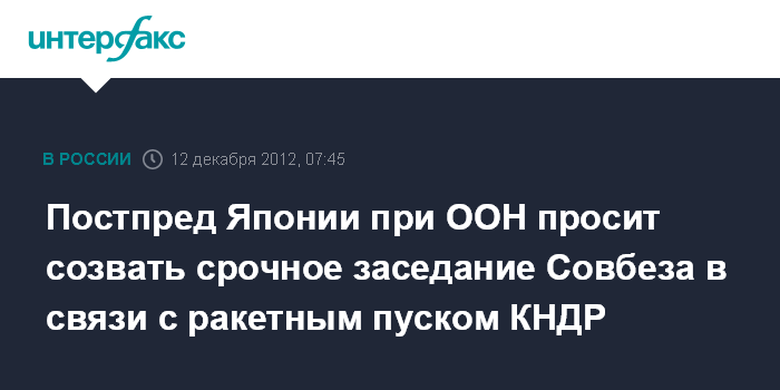 Нью-Йорк (ООН). 12 декабря. ИНТЕРФАКС - Постоянный представитель Японии при ООН обратился в Совет Безопасности с призывом о созыве экстренного заседания в связи с осуществленным КНДР в среду пуском баллистической ракеты со спутником, сообщили из ООН японские СМИ.