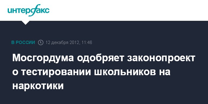 Москва. 12 декабря. INTERFAX.RU - Законопроект о добровольном тестировании в Москве учащихся старших классов школ и студентов на потребление наркотических веществ одобрен в первом чтении на заседании Мосгордумы в среду.
