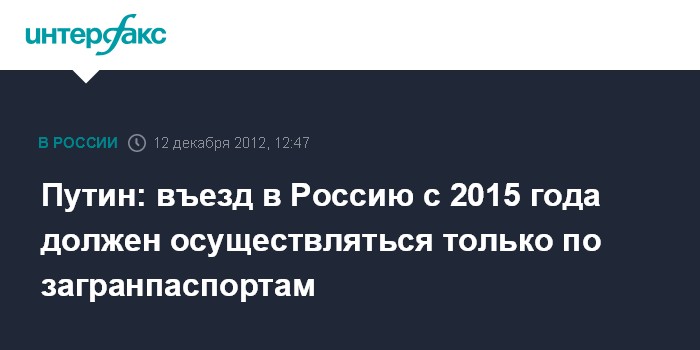 "Считаю, что не позднее, чем в 2015 году въезд в Россию должен быть разрешен исключительно по заграничным, а не внутренним паспортам других стран", - сказал Путин в Послании Федеральному Собранию в среду.