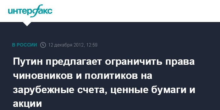 Москва. 12 декабря. INTERFAX.RU - России необходимо ввести ограничения для чиновников на счета в зарубежных банках, а также на ценные бумаги, заявил президент РФ Владимир Путин.