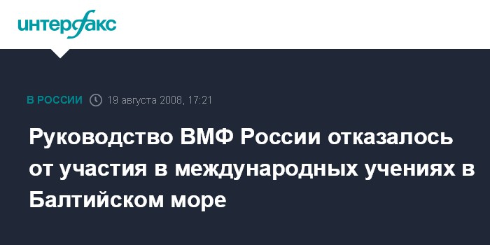Москва. 19 августа. INTERFAX.RU - Корабли российского ВМФ не будут участвовать в международных военно-морских учениях "Open Spirit - 2008" в акватории Балтийского моря, сообщил "Интерфаксу-АВН" помощник главкома ВМФ Игорь Дыгало.